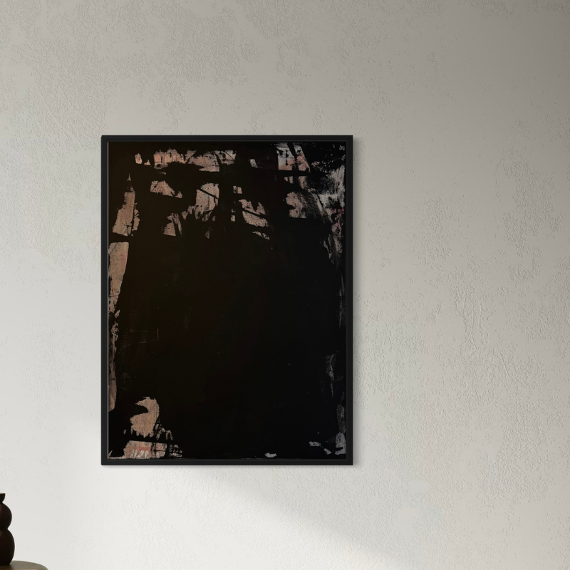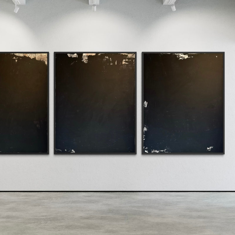 Each surface is layered, flattened, scraped, and pulled back, allowing earlier decisions to remain embedded within the work. Black operates not as absence, but as structure—holding dimension, atmosphere, and quiet intensity. Light enters with precision, emerging through restraint rather than contrast.