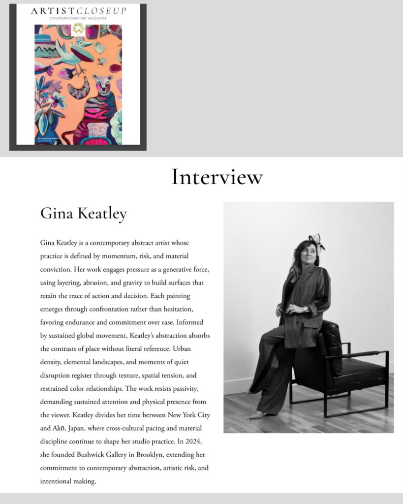 Gina Keatley is a contemporary abstract artist whose practice is defined by momentum, risk, and material conviction. Her work engages pressure as a generative force, using layering, abrasion, and gravity to build surfaces that retain the trace of action and decision. Each painting emerges through confrontation rather than hesitation, favoring endurance and commitment over ease. Informed by sustained global movement, Keatley’s abstraction absorbs the contrasts of place without literal reference. Urban density, elemental landscapes, and moments of quiet disruption register through texture, spatial tension, and restrained color relationships. The work resists passivity, demanding sustained attention and physical presence from the viewer. Keatley divides her time between New York City and Akō, Japan, where cross-cultural pacing and material discipline continue to shape her studio practice. In 2024, she founded Bushwick Gallery in Brooklyn, extending her commitment to contemporary abstraction, artistic risk, and intentional making.