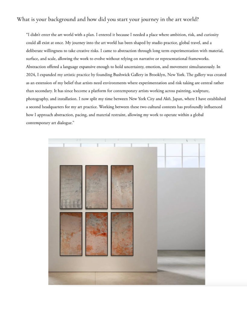 “I didn’t enter the art world with a plan. I entered it because I needed a place where ambition, risk, and curiosity could all exist at once. My journey into the art world has been shaped by studio practice, global travel, and a deliberate willingness to take creative risks. I came to abstraction through long term experimentation with material, surface, and scale, allowing the work to evolve without relying on narrative or representational frameworks. Abstraction offered a language expansive enough to hold uncertainty, emotion, and movement simultaneously. In 2024, I expanded my artistic practice by founding Bushwick Gallery in Brooklyn, New York. The gallery was created as an extension of my belief that artists need environments where experimentation and risk taking are central rather than secondary. It has since become a platform for contemporary artists working across painting, sculpture, photography, and installation. I now split my time between New York City and Akō, Japan, where I have established a second headquarters for my art practice. Working between these two cultural contexts has profoundly influenced how I approach abstraction, pacing, and material restraint, allowing my work to operate within a global contemporary art dialogue.”