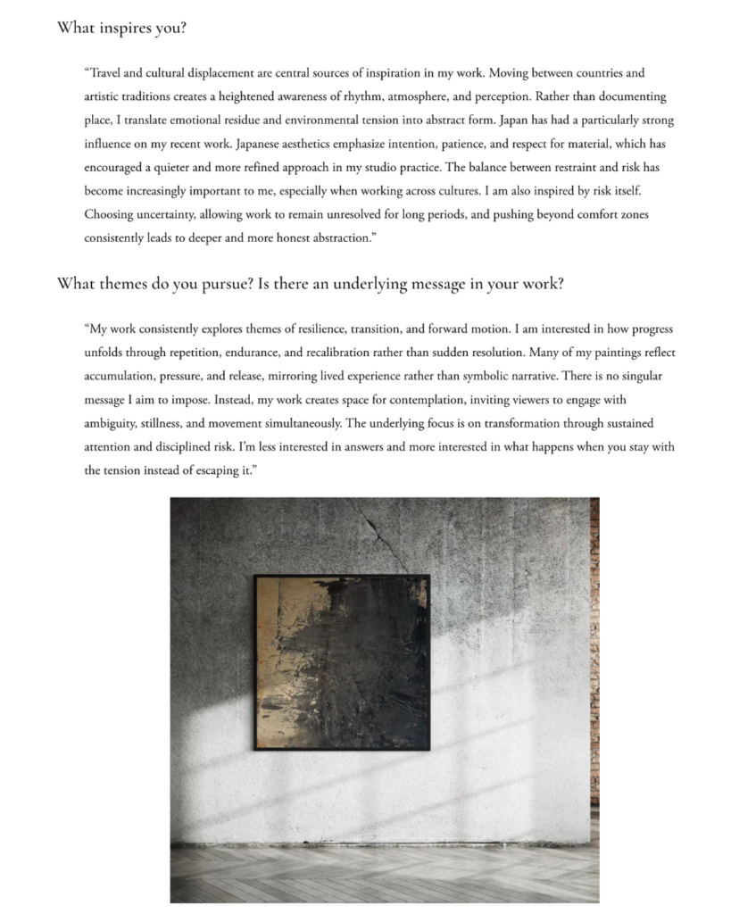 “Travel and cultural displacement are central sources of inspiration in my work. Moving between countries and artistic traditions creates a heightened awareness of rhythm, atmosphere, and perception. Rather than documenting place, I translate emotional residue and environmental tension into abstract form. Japan has had a particularly strong influence on my recent work. Japanese aesthetics emphasize intention, patience, and respect for material, which has encouraged a quieter and more refined approach in my studio practice. The balance between restraint and risk has become increasingly important to me, especially when working across cultures. I am also inspired by risk itself. Choosing uncertainty, allowing work to remain unresolved for long periods, and pushing beyond comfort zones consistently leads to deeper and more honest abstraction.”