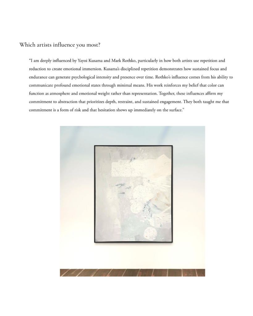 “I am deeply influenced by Yayoi Kusama and Mark Rothko, particularly in how both artists use repetition and reduction to create emotional immersion. Kusama’s disciplined repetition demonstrates how sustained focus and endurance can generate psychological intensity and presence over time. Rothko’s influence comes from his ability to communicate profound emotional states through minimal means. His work reinforces my belief that color can function as atmosphere and emotional weight rather than representation. Together, these influences affirm my commitment to abstraction that prioritizes depth, restraint, and sustained engagement. They both taught me that commitment is a form of risk and that hesitation shows up immediately on the surface.”